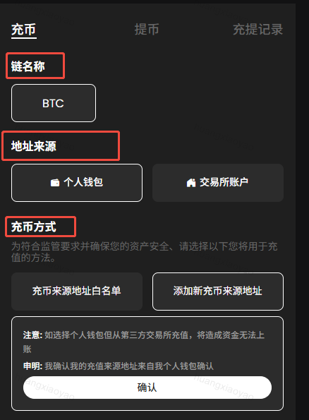 在【充币】模组选择链名称→选择地址来源,可以是【个人钱包】或【交易所帐户】