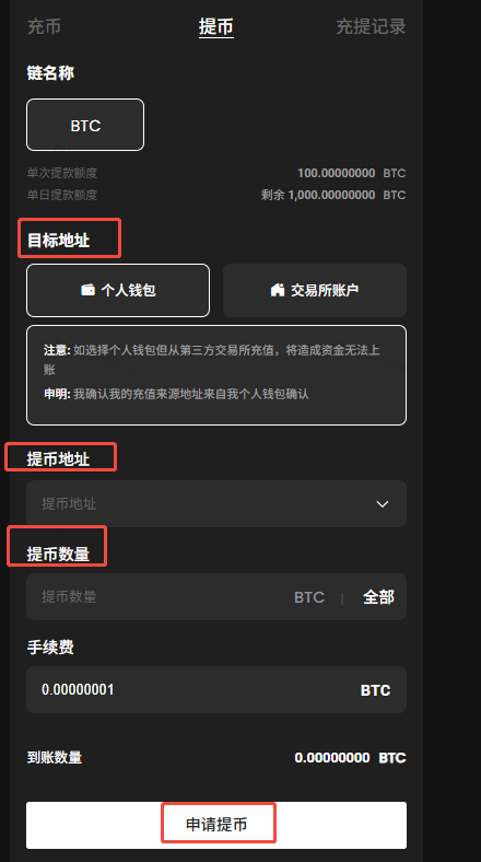 在【目标地址】中选择【个人钱包】→选择您的【提币地址】→填写【提币数量】→确认申请费后选择【申请提币】即可完成