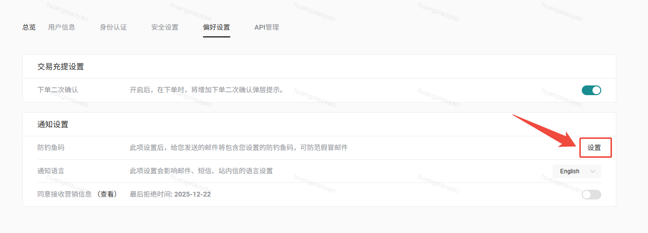 防钓鱼码设置流程:登录您的账户>【偏好设置】>【防钓鱼码】。